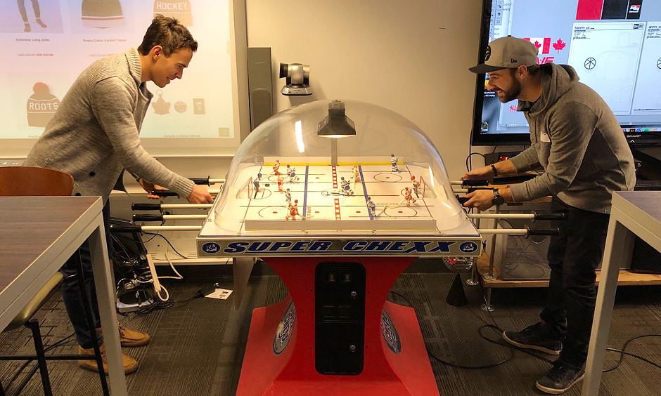 Schmidt Peterson Motorsports teammates James Hinchcliffe and Robert Wickens took their design skills to New Era Cap, where they provided input on some upcoming merch (below) and managed to get in a little friendly hockey competition (above).